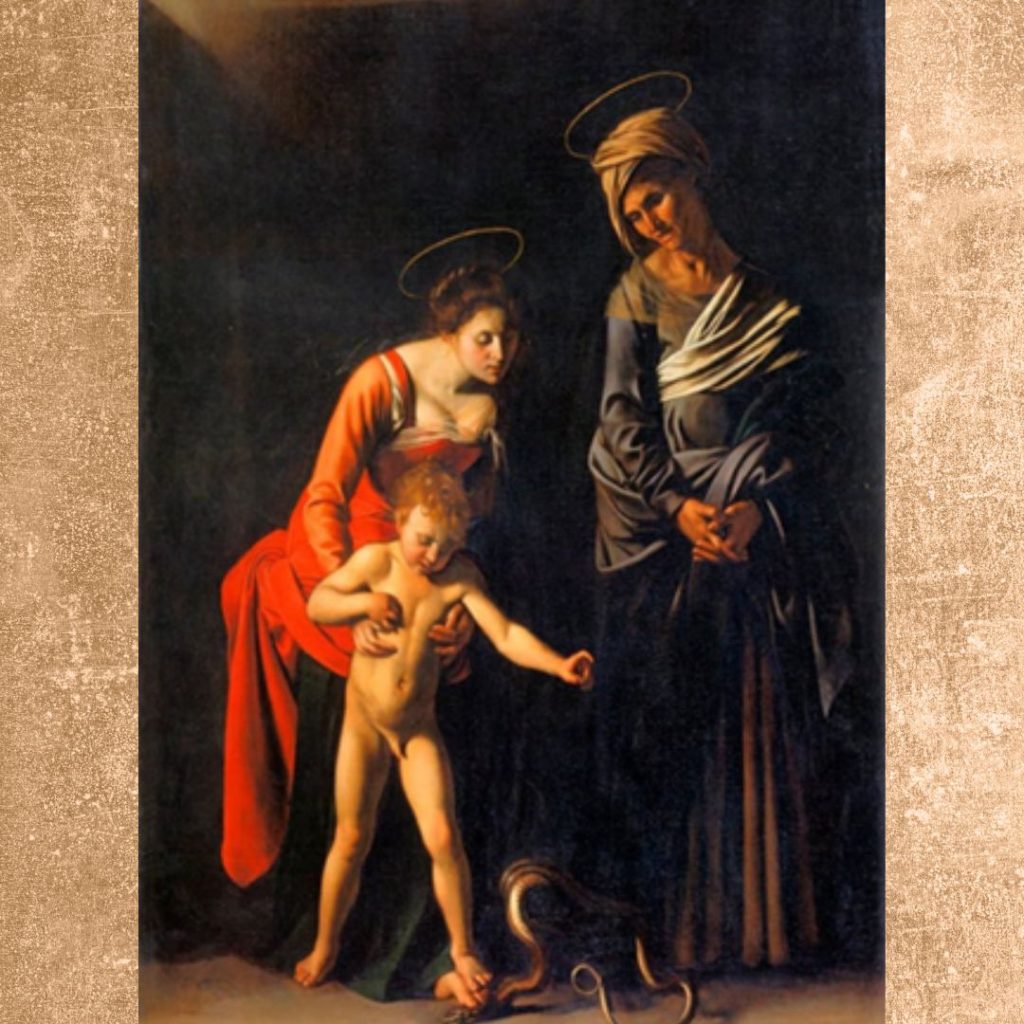 Dans une œuvre du peintre Michelangelo Merisi, dit le Caravage, cette vérité de la foi catholique est magnifiquement représentée : Marie soutient l’Enfant Jésus tandis que, devant eux, le serpent maudit rampe sur le sol. La Vierge s’apprête à écraser la tête de l’animal de son pied, mais c’est le petit pied de Jésus qui appuie sur celui de sa Mère et lui donne la force d’écraser invinciblement l’ennemi (Madone des Palefreniers, conservée à la Galerie Borghèse de Rome).