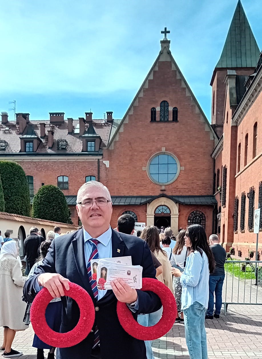 Malgré les longues files d’attente pour entrer dans la chapelle, M. Xavier Martin, représentant de la Fédération Pro Europa Christiana, a présenté en ce lieu bénit les intentions de prières envoyées par nos amis, a offert en leur nom un beau bouquet de fleurs et quatre couronnes remplies des petites roses.